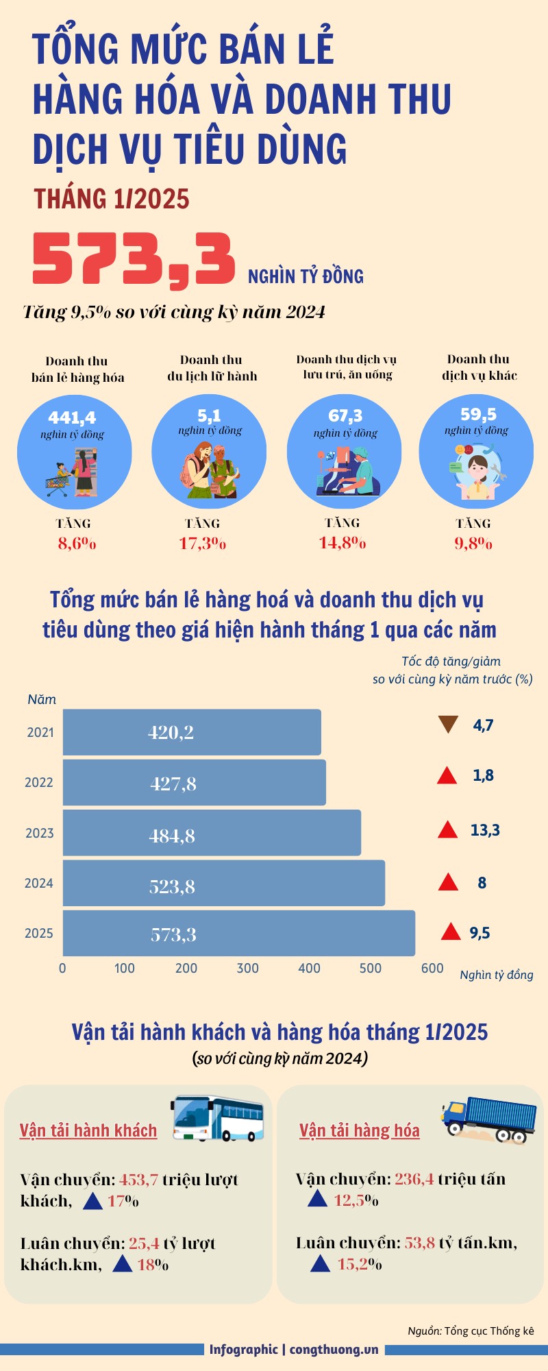 Số liệu Tổng cục Thống kê cho biết, trong tháng 1 năm 2025, tổng mức bán lẻ hàng hóa và doanh thu dịch vụ tiêu dùng theo giá hiện hành ước đạt 573,3 nghìn tỷ đồng, tăng 2,7% so với tháng trước và tăng 9,5% so với cùng kỳ năm trước (cùng kỳ năm 2024 tăng 8,0%).