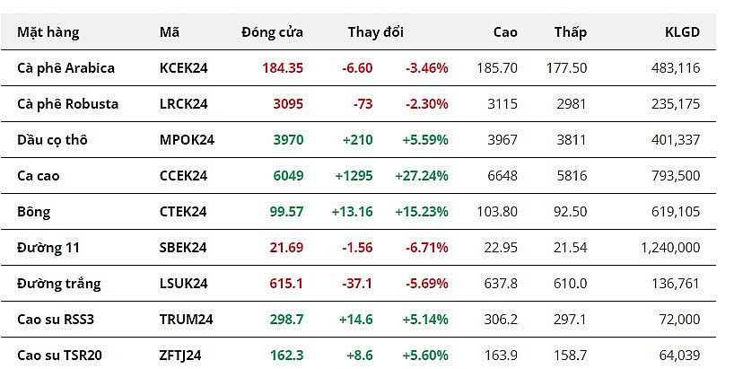 Theo sau ca cao, giá bông cũng tăng mạnh 15,23% trước tình trạng khan hiếm nguồn cung. Nổi bật nhất với mặt hàng này trong tháng qua chính là hai phiên tăng kịch trần liên tiếp, đẩy giá giao dịch lên mức cao nhất kể từ tháng 9/2022. Tồn kho thấp kỷ lục làm dấy lên rủi ro thiếu hụt nguồn cung.
