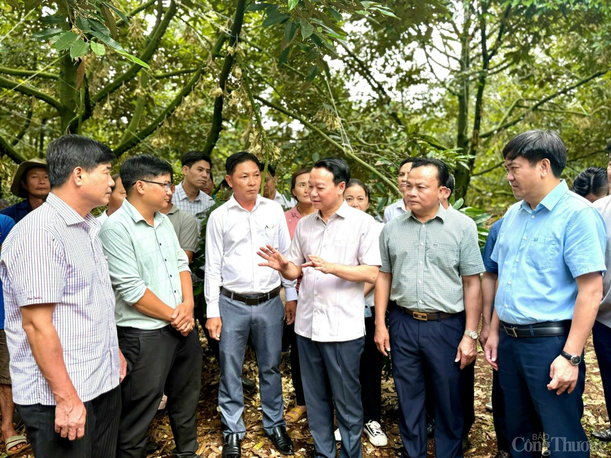 | Bộ trưởng Bộ Nông nghiệp và Môi trường Đỗ Đức Duy (thứ 3 từ phải qua) và Quyền Chủ tịch UBND tỉnh Đắk Lắk Nguyễn Thiên Văn (đầu tiên bên trái) cùng đoàn công tác đi thực địa vùng trồng sầu riêng tại huyện Krông Pắc (Đắk Lắk). |