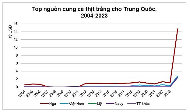 Cụ thể, theo thống kê của Trung tâm Thương mại Thế giới (ITC), từ năm 2004 đến 2023, Trung Quốc đã tiêu thụ gần 25 tỷ USD cá thịt trắng. Trong đó, Nga giữ vị trí dẫn đầu với 15 tỷ USD, chiếm 60% tổng kim ngạch nhập khẩu. Tuy nhiên, Việt Nam cũng đã ghi dấu ấn đáng kể khi đóng góp gần 3 tỷ USD, chiếm 11% thị phần trong giai đoạn này.