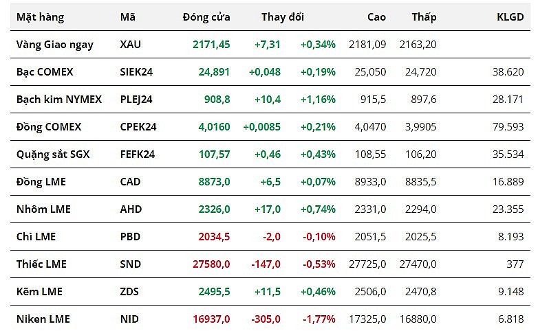 Đối với kim loại cơ bản, sau phiên giảm hơn 1% vào cuối tuần trước, giá đồng COMEX phục hồi 0,21% lên 4,01 USD/pound. Lực mua đồng được kích hoạt nhờ kỳ vọng Trung Quốc sẽ tiếp tục hỗ trợ nền kinh tế. Trong bài phát biểu tại Diễn đàn Phát triển Trung Quốc hôm Chủ nhật, Thủ tướng Trung Quốc Lý Cường đã hạ thấp những mối lo ngại về những thách thức mà nền kinh tế nước này phải đối mặt. Đồng thời, ông cho biết Bắc Kinh sẽ đẩy mạnh các biện pháp hỗ trợ tăng trưởng.