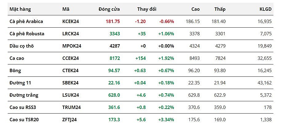Giá đường 11 nhích nhẹ 0,18% so với mức tham chiếu. Các thông tin trái chiều về sản lượng đường tại các quốc gia sản xuất chính đã tạo nên diễn biến giằng co trong phiên. Theo công ty Fitch Solutions, việc cắt giảm diện tích trồng mía tại các bang chính của Ấn Độ kết hợp với sản lượng tại Trung Nam của Brazil dự kiến giảm trong niên vụ 24/25 đang là yếu tố thúc đẩy lực phục hồi của giá.