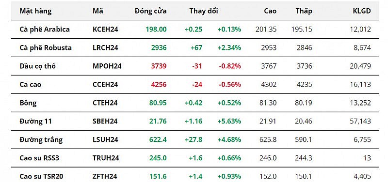 Giá bông tăng phiên thứ 4 liên tiếp, đóng cửa giá cao hơn mức tham chiếu 0,52%. Thị trường đang kỳ vọng tích cực vào số liệu bán hàng và xuất khẩu bông tại Mỹ, sau lực tăng mạnh của báo cáo tuần trước. Do nghỉ Lễ Giáng Sinh, báo cáo xuất khẩu hàng tuần sẽ công bố muộn 1 ngày.