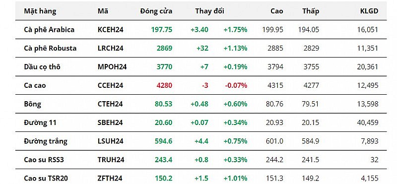 Giá bông tăng 0,60%, đây là phiên tăng thứ ba liên tiếp của mặt hàng này. Thị trường đang kỳ vọng số liệu từ báo cáo xuất khẩu bông Mỹ hàng tuần sẽ tiếp tục tích cực như tuần trước. Điều này có thể phần nào hạ nhiệt lo ngại nhu cầu bông ở mức thấp.
