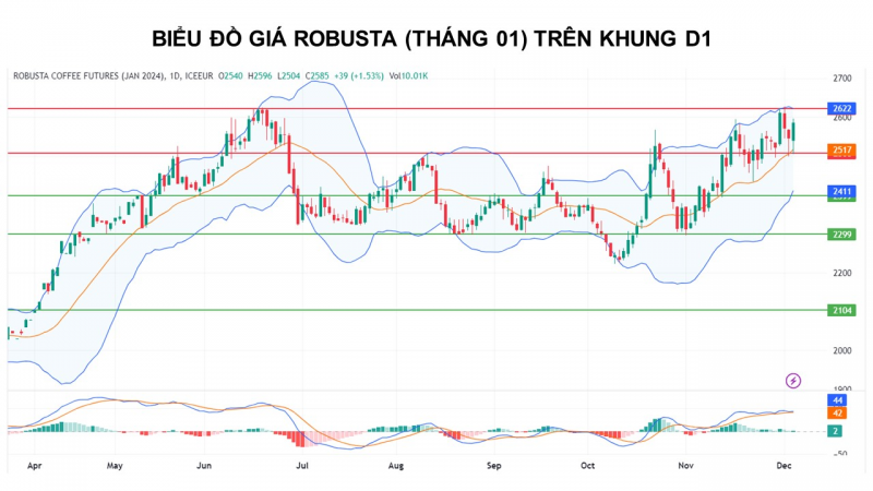 Nhận định: Giá Robusta trong phiên hôm nay dự kiến sẽ tiếp tục biến động trong khung 2.530 – 2.600 USD/tấn.