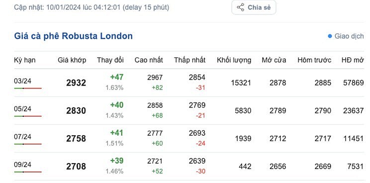 Cụ thể, giá cà phê Robusta trên sàn London ngày 10/1/2024 tiếp đà tăng cao, mức tăng từ 39 - 47 USD/tấn, dao động từ 2.639 - 2.967 USD/tấn. Cụ thể, kỳ hạn giao hàng tháng 3/2024 là 2.932 USD/tấn (tăng 47 USD/tấn); kỳ hạn giao hàng tháng 5/2024 là 2.830 USD/tấn (tăng 40 USD/tấn); kỳ hạn giao tháng 7/2024 là 2.758 USD/tấn (tăng 41 USD/tấn) và kỳ hạn giao tháng 9/2024 là 2.708 USD/tấn (tăng 39 USD/tấn).