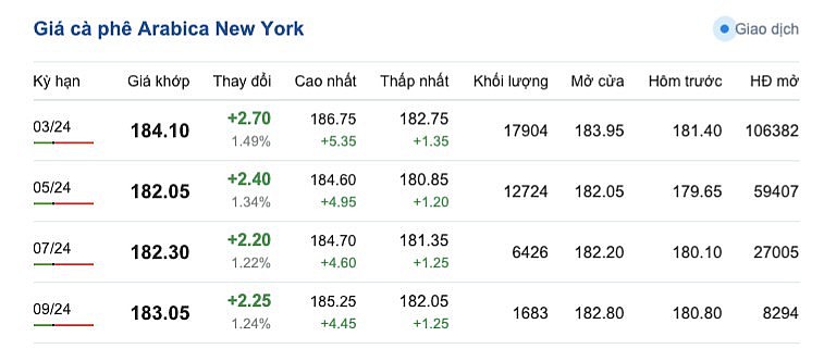 Tương tự, giá cà phê Arabica trên sàn New York ngày 10/1/2024 tăng trở lại, lấy lại sắc xanh so với phiên giao dịch trước đó, mức tăng trên 1%, dao động 180,85 - 186,75 cent/lb. Cụ thể, kỳ hạn giao hàng tháng 3/2024 là 184,10 cent/lb; kỳ giao hàng tháng 5/2024 là 182,05 cent/lb; kỳ giao hàng tháng 7/2024 là 182,30 và kỳ hạn giao hàng tháng 9/2024 là 183,05 cent/lb.