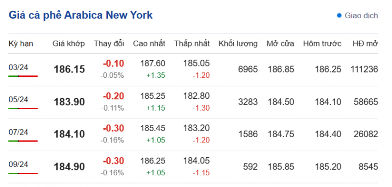 Tương tự, giá cà phê Arabica trên sàn New York ngày 5/1 tiếp tục giảm mạnh. Cụ thể, kỳ hạn giao hàng tháng 3/2024 là 186,15 cent/lb (giảm 0,05%%); kỳ giao hàng tháng 5/2024 là 183,90 cent/lb (giảm 0,11%); kỳ giao hàng tháng 7/2024 là 184,10 cent/lb (giảm 0,16%%) và kỳ giao hàng tháng 9/2024 là 184,90 cent/lb (giảm 0,16%).