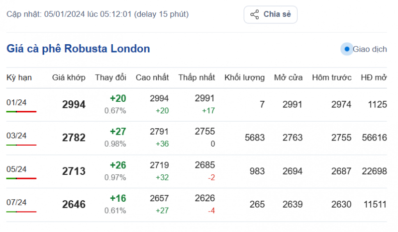 Trái ngược, giá cà phê Robusta trên sàn London ngày 5/1/2024 bất ngờ tăng trở lại, tới 27 USD/kg, dao động từ 2.646 - 2.994 USD/tấn. Cụ thể, kỳ hạn giao hàng tháng 1/2024 là 2.994 USD/tấn; kỳ hạn giao hàng tháng 3/2024 là 2.782 USD/tấn; kỳ hạn giao hàng tháng 5/2024 là 2.713 USD/tấn và kỳ hạn giao hàng tháng 7/2024 là 2.646 USD/tấn.