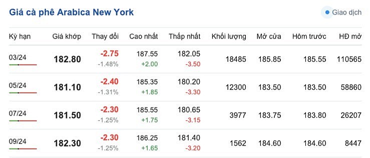 Cụ thể, giá cà phê Arabica trên sàn New York sáng ngày 8/1/2024 ít biến động, ổn định ở mức giá khá cao, dao động 181,40 - 187,55 cent/lb. Cụ thể, kỳ hạn giao hàng tháng 3/2024 là 182,80 cent/lb; kỳ giao hàng tháng 5/2024 là 181,10 cent/lb; kỳ giao hàng tháng 7/2024 là 181.50 và kỳ hạn 9/2024 là 182.30.