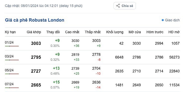 Tương tự, giá cà phê Robusta trên sàn London ngày 8/1/2024, tiếp tục giữ mức ổn định so với phiên giao dịch trước đó, dao động từ 2.636 - 3.030 USD/tấn. Cụ thể, kỳ hạn giao hàng tháng 1/2024 là 3.003 USD/tấn; kỳ hạn giao hàng tháng 3/2024 là 2.795 USD/tấn; kỳ hạn giao tháng 5/2024 là 2727 USD/tấn và kỳ hạn giao tháng 7/2024 là 2.665 USD/tấn.