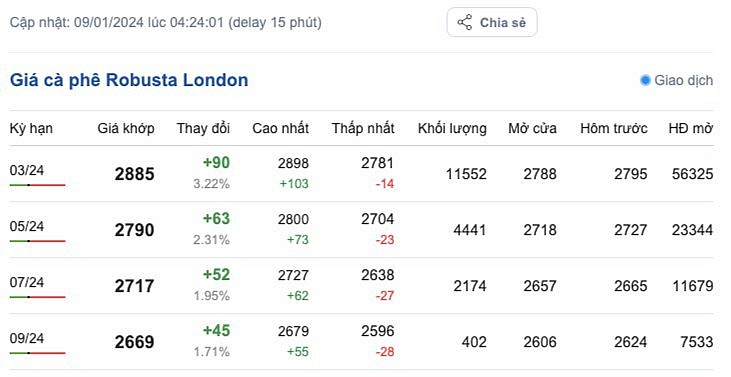 Giá cà phê Robusta trên sàn London ngày 9/1/2024 quay đầu tăng mạnh so với phiên giao dịch trước, mức tăng từ 45 - 90 USD/tấn, dao động từ 2.596 - 2.898 USD/tấn. Cụ thể, kỳ hạn giao hàng tháng 3/2024 là 2.885 USD/tấn (tăng 90 USD/tấn); kỳ hạn giao hàng tháng 5/2024 là 2.790 USD/tấn (tăng 63 USD/tấn); kỳ hạn giao tháng 7/2024 là 2.717 USD/tấn (tăng 52 USD/tấn) và kỳ hạn giao tháng 9/2024 là 2.669 USD/tấn (tăng 45 USD/tấn).