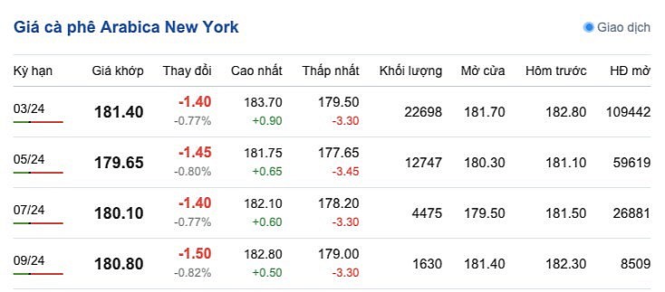 Trái lại, giá cà phê Arabica trên sàn New York ngày 9/1/2024 giảm nhẹ so với phiên giao dịch trước đó, mức giảm dưới 1%, dao động 179,00 - 183,70 cent/lb. Cụ thể, kỳ hạn giao hàng tháng 3/2024 là 181,40 cent/lb; kỳ giao hàng tháng 5/2024 là 179,65 cent/lb; kỳ giao hàng tháng 7/2024 là 180.10 và kỳ hạn gioa hàng tháng 9/2024 là 180.80 cent/lb.