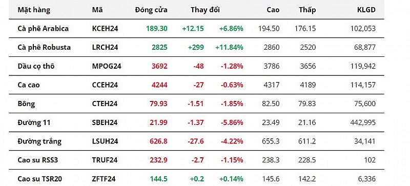Viện Khí tượng Quốc gia Brazil (INMET) cảnh báo khu vực Đông Nam, vùng trồng cà phê chính của Brazil có thể hứng chịu nắng nóng gay gắt trong 4 ngày liên tiếp, thậm chí nền nhiệt có khả lên trên 40 độ C vào cuối tuần. Cùng với những lo ngại về độ ẩm dưới mức trung bình, khiến thị trường lo ngại cây cà phê sẽ không phát triển trong điều kiện phù hợp. Điều này khả năng đẩy sản lượng cà phê niên vụ 2024/25 tại Brazil không tốt như kỳ vọng trước đó. Mức tăng mạnh trong tuần vừa qua đẩy giá Arabica và Robusta lên mức cao nhất trong gần 6 tháng.