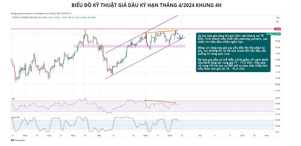 Về mặt kỹ thuật giá dầu, khung 4H, áp lực bán gia tăng khi giá tiệm cận kháng cự 79 USD, hình thành mẫu hình nến piercing pattern, xác nhận tín hiệu đảo chiều ngắn hạn. Động lực tăng của giá suy yếu dần khi RSI phân kỳ âm, hai đường %D và %K của Stoch RSI bắt đầu cắt xuống từ vùng quá mua. Dự báo giá dầu có thể điều chỉnh giảm về vùng hỗ trợ 77 - 77,2 USD.