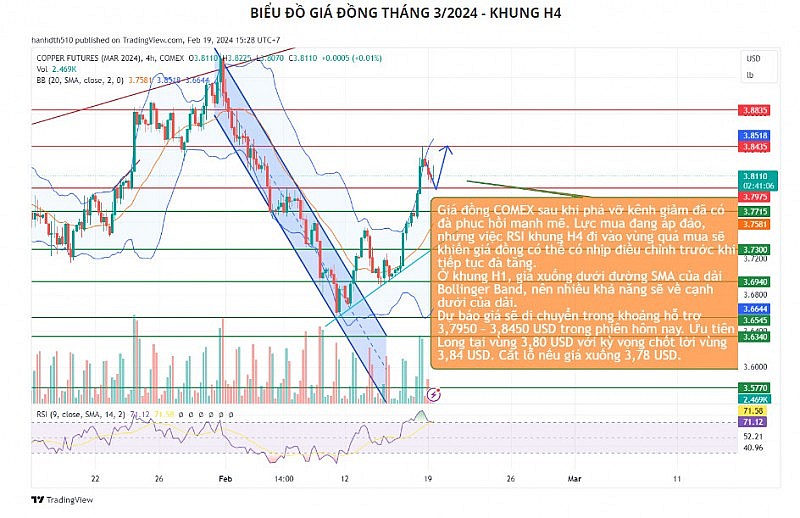 Về mặt kỹ thuật, giá đồng COMEX sau khi phá vỡ kênh giảm đã có đà phục hồi mạnh mẽ. Lực mua đang áp đảo, nhưng việc RSI khung H4 đi vào vùng quá mua sẽ khiến giá đồng có thể có nhịp điều chỉnh trước khi tiếp tục đà tăng. Ở khung H1, giá xuống dưới đường SMA của dải Bollinger Band, nên nhiều khả năng sẽ về cạnh dưới của dải. Dự báo giá sẽ di chuyển trong khoảng hỗ trợ 3,7950 – 3,8450 USD trong phiên hôm nay. Ưu tiên Long tại vùng 3,80 USD với kỳ vọng chốt lời vùng 3,84 USD. Cắt lỗ nếu giá xuống 3,78 USD.