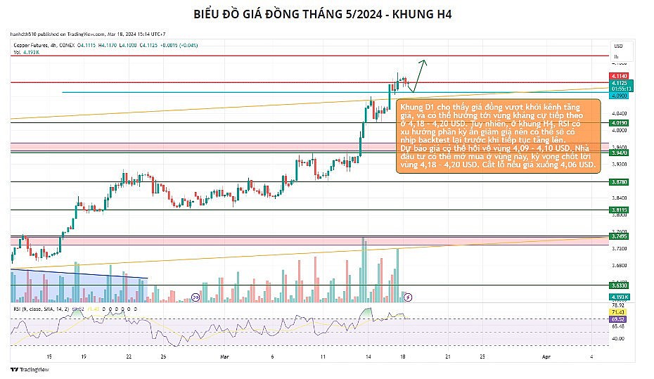 Về mặt kỹ thuật, khung D1 cho thấy giá đồng vượt khỏi kênh tăng giá, và có thể hướng tới vùng kháng cự tiếp theo ở 4,18 – 4,20 USD. Tuy nhiên, ở khung H4, RSI có xu hướng phân kỳ ẩn giảm giá nên có thể sẽ có nhịp backtest lại trước khi tiếp tục tăng lên. Dự báo giá có thể hồi về vùng 4,09 – 4,10 USD. Nhà đầu tư có thể mở mua ở vùng này, kỳ vọng chốt lời vùng 4,18 – 4,20 USD. Cắt lỗ nếu giá xuống 4,06 USD.