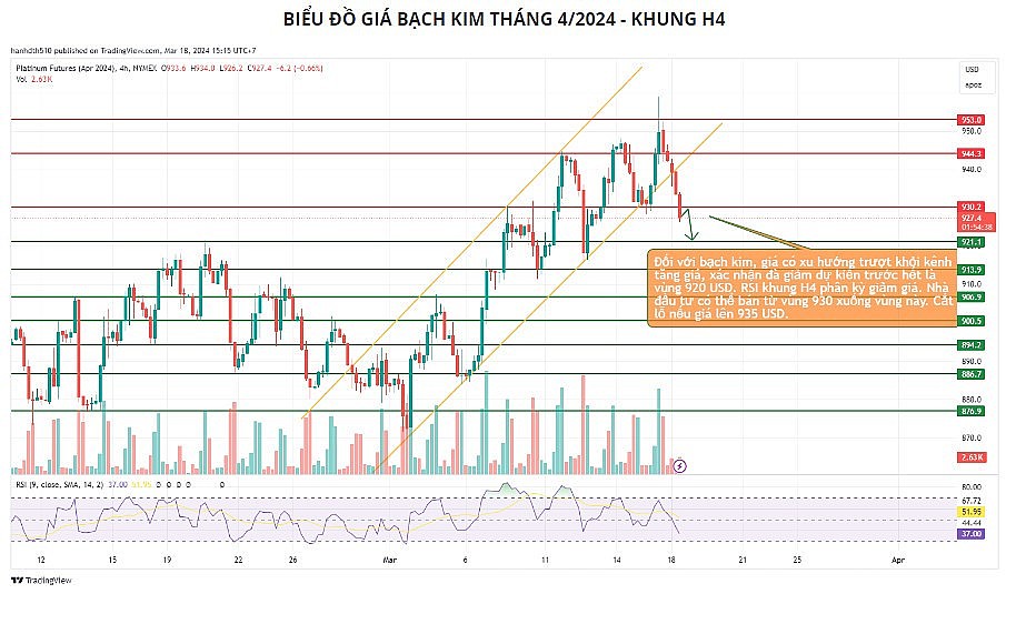Đối với bạch kim, giá có xu hướng trượt khỏi kênh tăng giá, xác nhận đà giảm dự kiến trước hết là vùng 920 USD. RSI khung H4 phân kỳ giảm giá. Nhà đầu tư có thể bán từ vùng 930 xuống vùng này. Cắt lỗ nếu giá lên 935 USD.