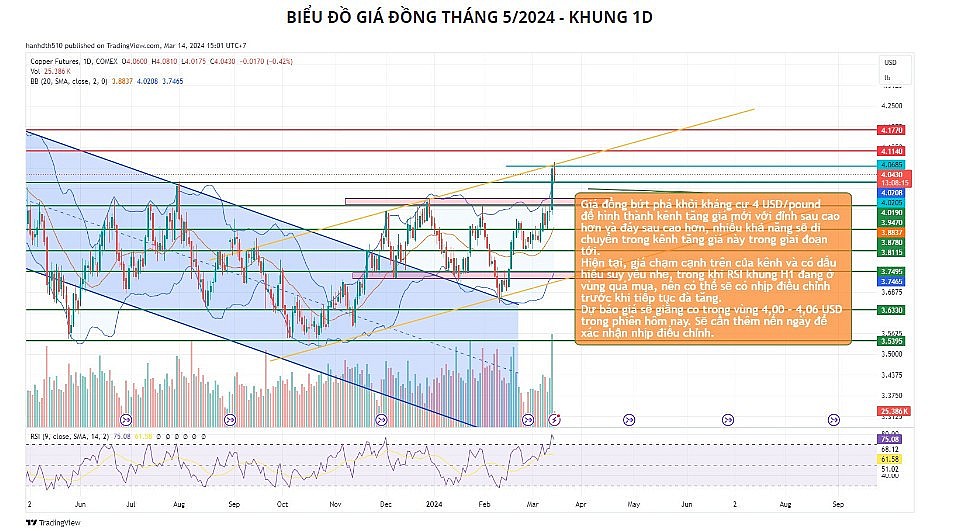 Về mặt kỹ thuật giá đồng khung Daily, giá đồng bứt phá khỏi vùng kháng cự 4 USD/pound để hình thành kênh tăng giá mới với đỉnh sau cao hơn và đáy sau cao hơn, nhiều khả năng sẽ di chuyển trong kênh tăng giá này trong giai đoạn tới. Hiện tại, giá chạm cạnh trên của kênh và có dấu hiệu suy yếu nhẹ, trong khi RSI khung H1 đang ở vùng quá mua, nên có thể sẽ có nhịp điều chỉnh trước khi tiếp tục đà tăng. Dự báo giá sẽ giằng co trong vùng 4,00 – 4,06 USD trong phiên hôm nay. Sẽ cần thêm nến ngày để xác nhận nhịp điều chỉnh.