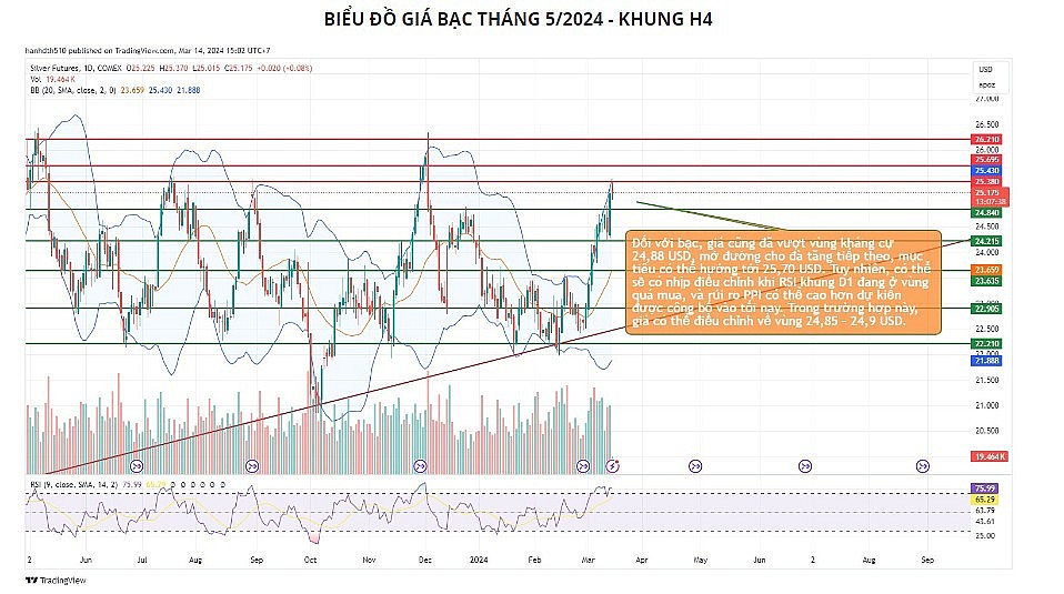 Đối với bạc, khung H4, giá cũng đã vượt vùng kháng cự 24,88 USD, mở đường cho đà tăng tiếp theo, mục tiêu có thể hướng tới 25,70 USD. Tuy nhiên, có thể sẽ có nhịp điều chỉnh khi RSI khung D1 đang ở vùng quá mua, và rủi ro PPI có thể cao hơn dự kiến được công bố vào tối nay. Trong trường hợp này, giá có thể điều chỉnh về vùng 24,85 – 24,9 USD.
