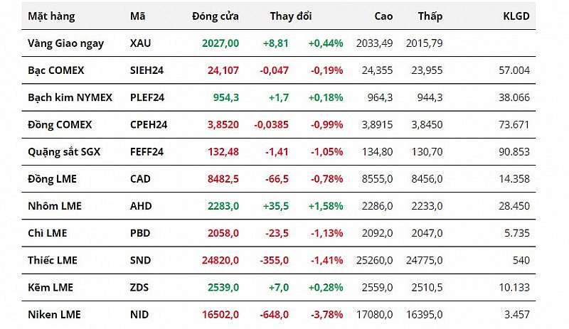 Đối với kim loại quý, giá bạc để mất 0,19% dừng chân tại 24,1 USD/ounce. Trái lại, giá bạch kim tăng 0,18% lên 954,3 USD/ounce.