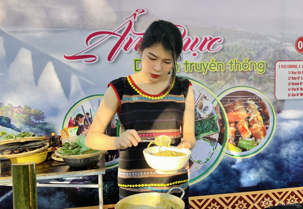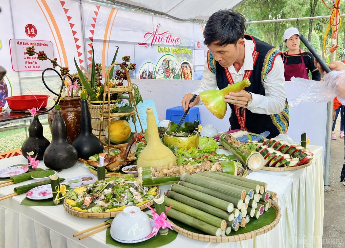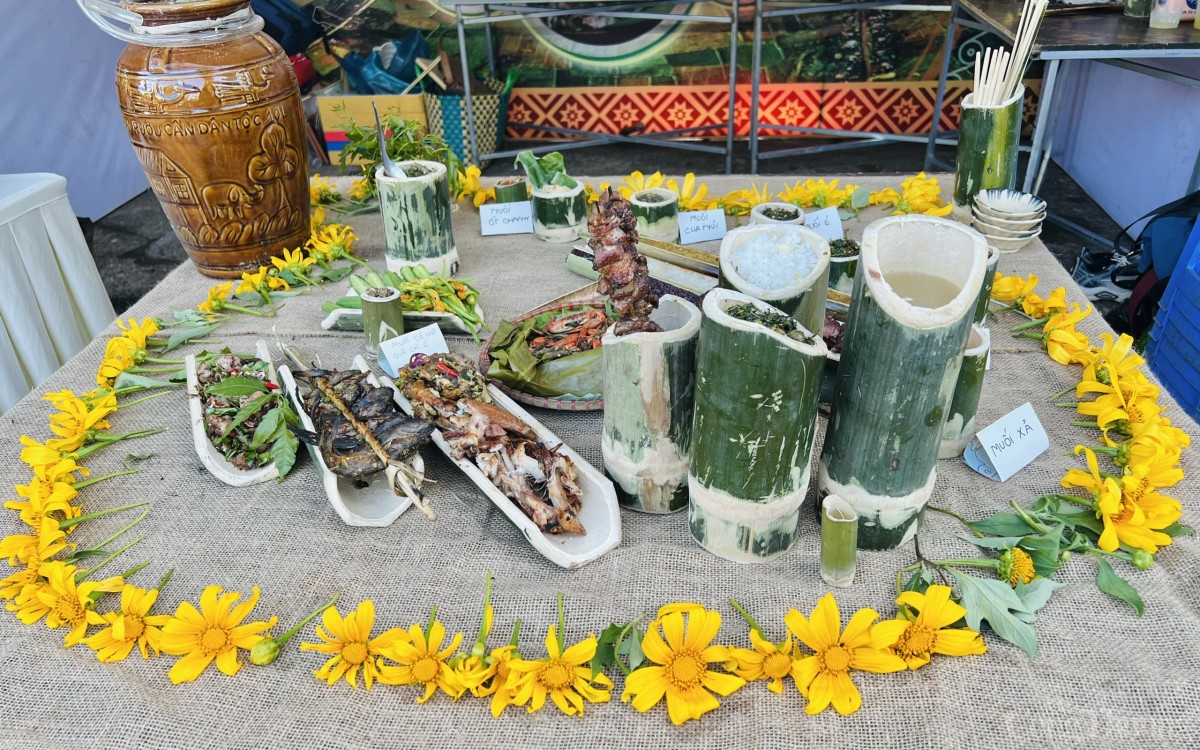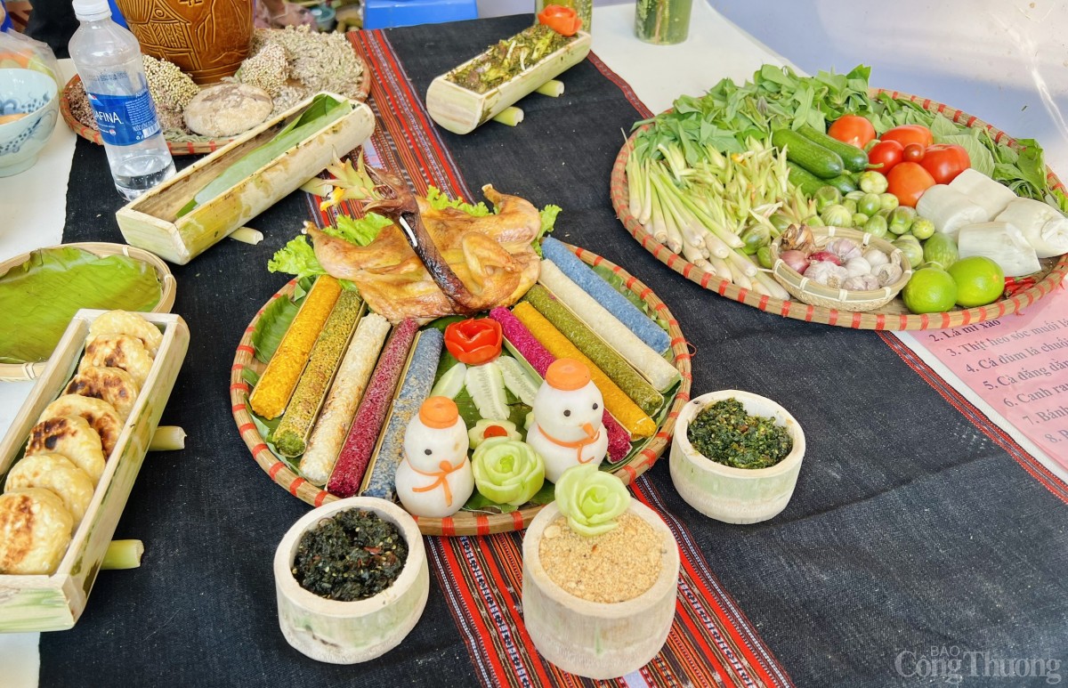 Từ các nguyên liệu đặc trưng của núi rừng như gà, cá sông Pô Cô, rau rừng, măng, quả ươi,... qua bàn tay khéo léo, công phu của các nghệ nhân, những món ăn được hoàn thiện và trưng bày vô cùng đẹp mắt.