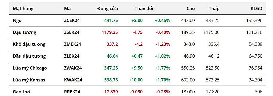 Giá ngô và đậu tương chỉ diễn biến giằng co và kết phiên với mức biến động nhẹ. Nhìn chung, phe mua vẫn có phần chiếm ưu thế hơn trong phiên hôm qua, với 3/5 mặt hàng ghi nhận tăng giá.