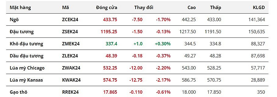 Giá ngô hợp đồng tháng 5 quay đầu giảm mạnh trong phiên hôm qua và kết thúc xu hướng giằng co kéo dài trong 4 phiên trước đó.Hội đồng Ngũ cốc Quốc tế (IGC) dự báo, sản lượng ngô toàn cầu niên vụ 24/25 sẽ đạt mức 1,233 tỷ tấn, tăng so với 1,227 tỷ tấn của niên vụ hiện tại. Triển vọng nguồn cung thế giới dồi dào hơn trong niên vụ tới đã tác động “bearish” lên giá ngô.