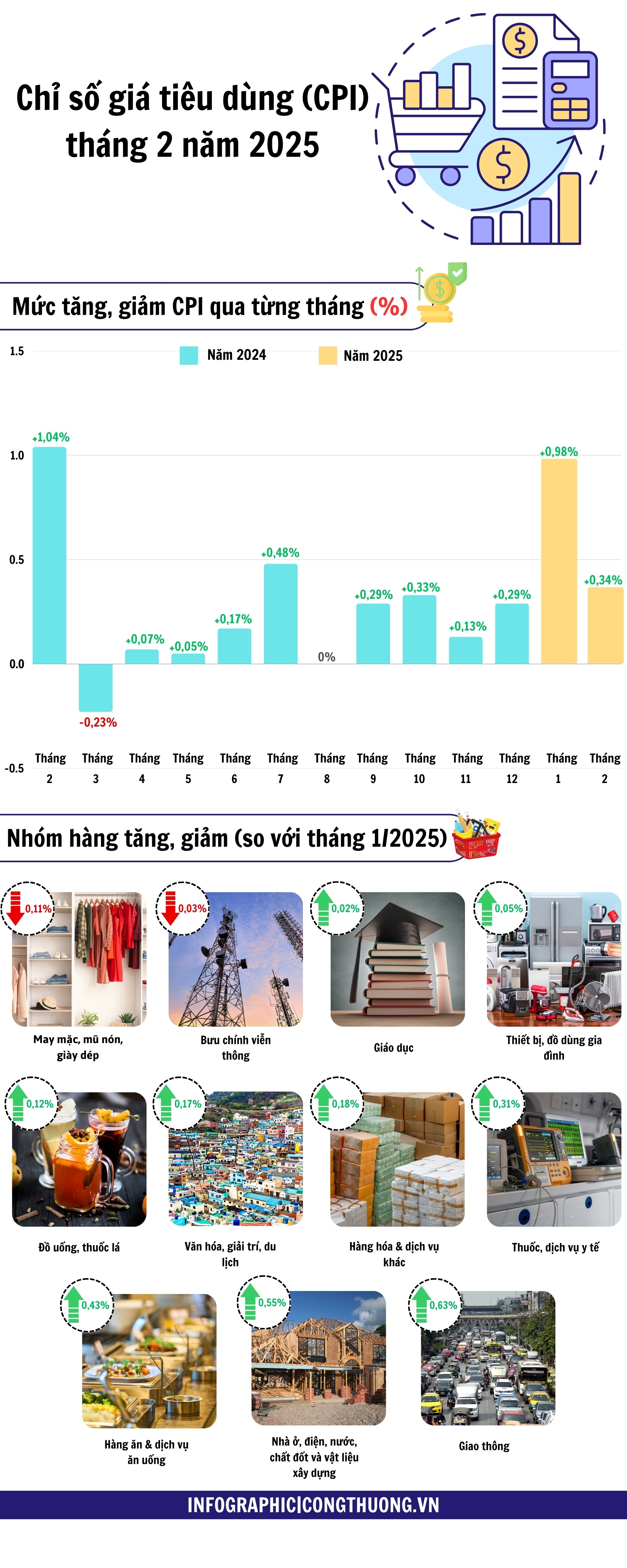 Theo báo cáo của Cục Thống kê (Bộ Tài chính) về tình hình kinh tế xã hội, bình quân 2 tháng đầu năm 2025, chỉ số giá tiêu dùng tháng 2/2025 tăng 0,34% so với tháng trước. Trong đó, có 9 nhóm hàng hóa và dịch vụ có chỉ số giá tăng và 2 nhóm hàng có chỉ số giá giảm.
