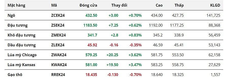 Đối với ngô, phe mua chiếm ưu thế và giúp giá tăng nhẹ 0,5%. Báo cáo Export Inspections tối qua cho thấy, Mỹ đã giao 918.610 tấn ngô trong tuần 9 - 15/2, tăng so với mức 892.335 tấn của tuần trước đó và vượt xa mức cùng kỳ năm ngoái. Khối lượng giao hàng duy trì ở mức cao cho thấy nhu cầu đối với ngô Mỹ vẫn đang tương đối tích cực và hỗ trợ đến giá.