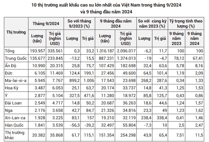 9 tháng năm 2024, Trung Quốc vẫn là thị trường xuất khẩu cao su lớn nhất của Việt Nam, đạt 887 nghìn tấn, trị giá 1.374 triệu USD chiếm gần 78% tổng lượng cao su xuất khẩu của cả nước, giảm 19% về lượng và giảm 4,7% về trị giá so với cùng kỳ năm 2023.