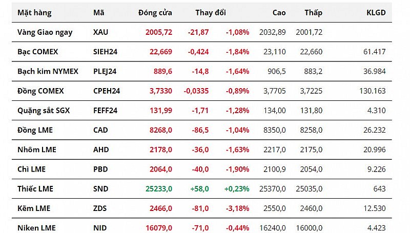 Đối với nhóm kim loại quý, giá bạc giảm 1,84% xuống sát mốc 22,7 USD/ounce. Bạch kim thậm chí ghi nhận phiên giảm giá thứ bảy liên tiếp, giảm 1,64%, đánh mất mốc 900 USD/ounce và đạt mức thấp nhất kể từ tháng 11 năm ngoái.