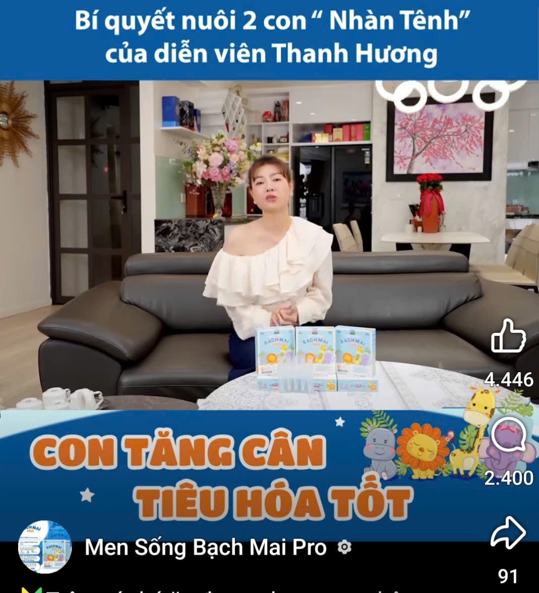 Chiều 23/4, phóng viên Báo Công Thương đã có buổi trao đổi với Cục An toàn thực phẩm (Bộ Y tế) liên quan đến hoạt động quảng cáo sản phẩm Men sống Bạch Mai Pro của diễn viên Thanh Hương trên mạng xã hội. Lãnh đạo Cục cho biết: “Trường hợp người thực hiện quảng cáo là diễn viên như bà Thanh Hương, Cục sẽ chuyển nội dung sang Bộ Văn hóa, Thể thao và Du lịch để xem xét, xử lý sai phạm (nếu có) theo quy định”.
