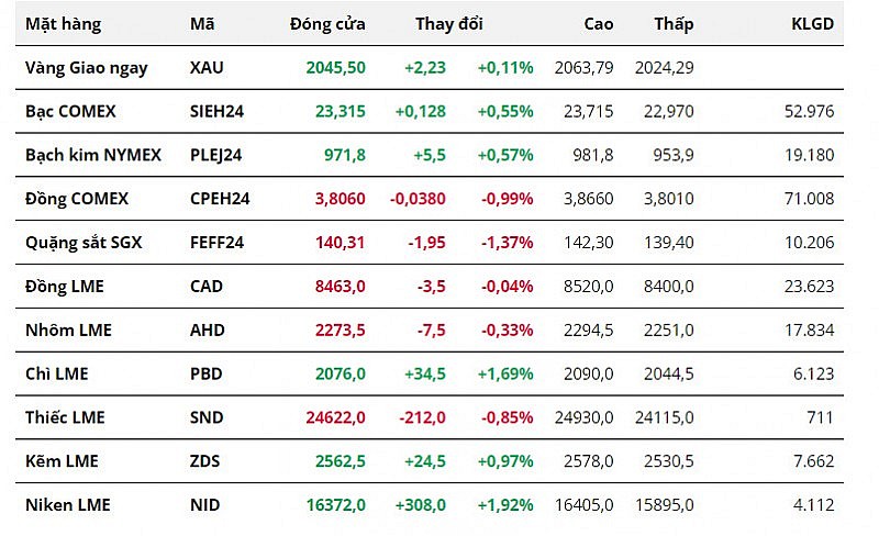 Đối với nhóm kim loại quý, cả giá bạc và bạch kim đều kết phiên trong sắc xanh sau khi trải qua một phiên biến động mạnh. Cụ thể, giá bạc tăng 0,55% lên 23,31 USD/ounce. Giá bạch kim chấm dứt chuỗi giảm 4 phiên liên tiếp, đóng cửa tại mức 971,8 USD/ounce sau khi tăng 0,57%.