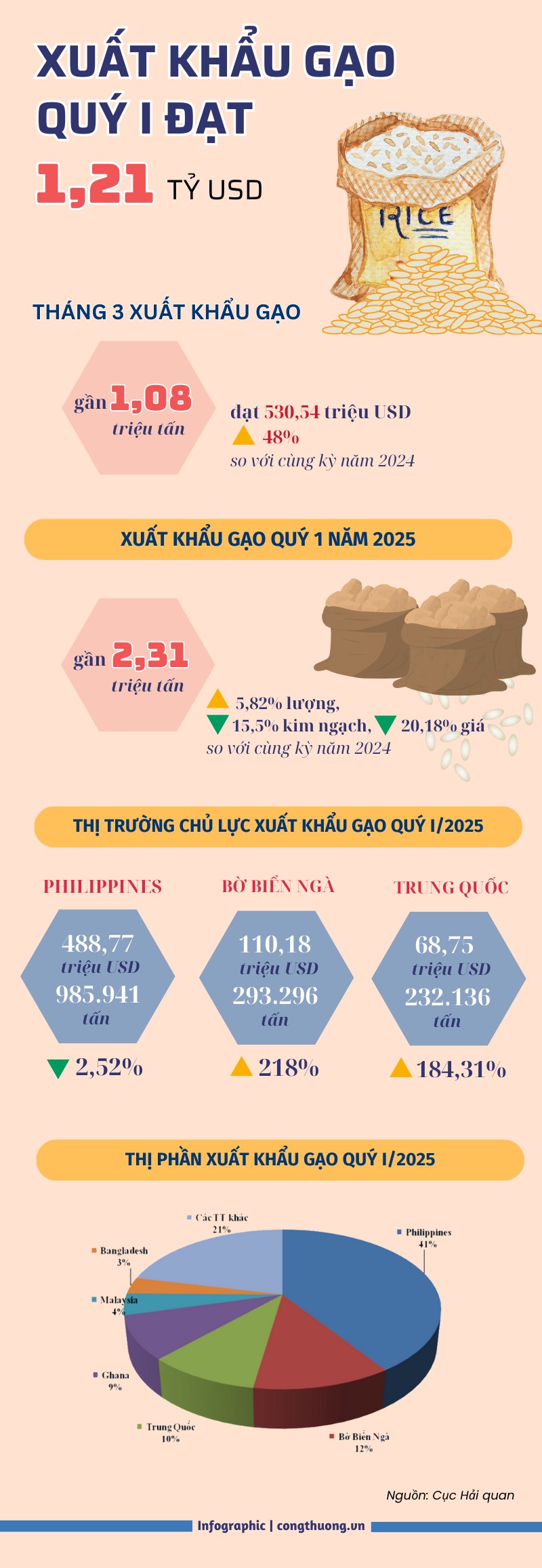 Theo Cục Hải quan, tính chung quý I/2025, xuất khẩu gạo của cả nước đạt gần 2,31 triệu tấn, tương đương gần 1,21 tỷ USD, giá trung bình 522 USD/tấn, tăng 5,82% về lượng, nhưng giảm 15,5% về kim ngạch và giảm 20,18% về giá so với quý I/2024.