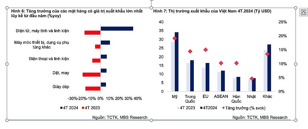 Về thị trường xuất khẩu 4 tháng đầu năm 2024, Hoa Kỳ là thị trường lớn nhất của Việt Nam với mức kim ngạch xuất nhập khẩu ước đạt 34,1 tỷ USD (tăng 19,1% so với cùng kỳ), xuất khẩu sang EU ước đạt 16,4 tỷ USD (tăng 15% so với cùng kỳ); xuất khẩu sang Nhật Bản 7,7 tỷ USD (tăng 4,6% so với cùng kỳ).