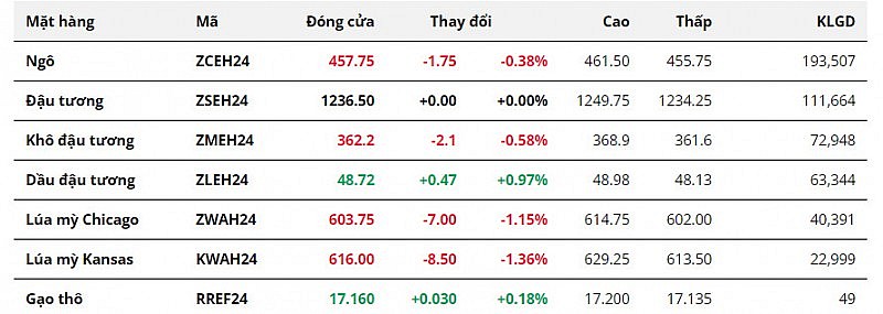 Đối với ngô, ghi nhận mức giảm nhẹ 0,38% với diễn biến trong phiên tương đối giằng co. BCR dự báo, sản lượng ngô niên vụ 23/24 của Argentina sẽ đạt 59 triệu tấn, tăng 64%, nhờ điều kiện thời tiết tốt hơn. Điều này giúp xoa dịu lo ngại của thị trường về vụ mùa bị thiệt hại tại Brazil, đồng thời tác động “bearish” đến giá. Ngược lại, sự xuất hiện của đơn hàng Daily Export Sales sau thời gian dài vắng bóng đã phần nào hỗ trợ giá trong phiên tối qua. Khối lượng bán hàng mặc dù không quá lớn, chỉ 175.000 tấn ngô, nhưng vẫn mang lại tín hiệu khả quan về nhu cầu quốc tế đối với ngô Mỹ.